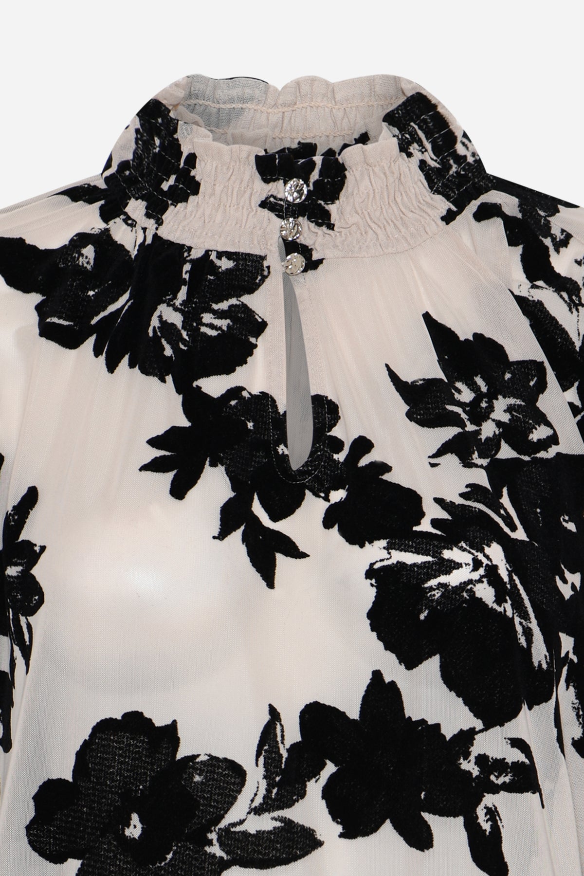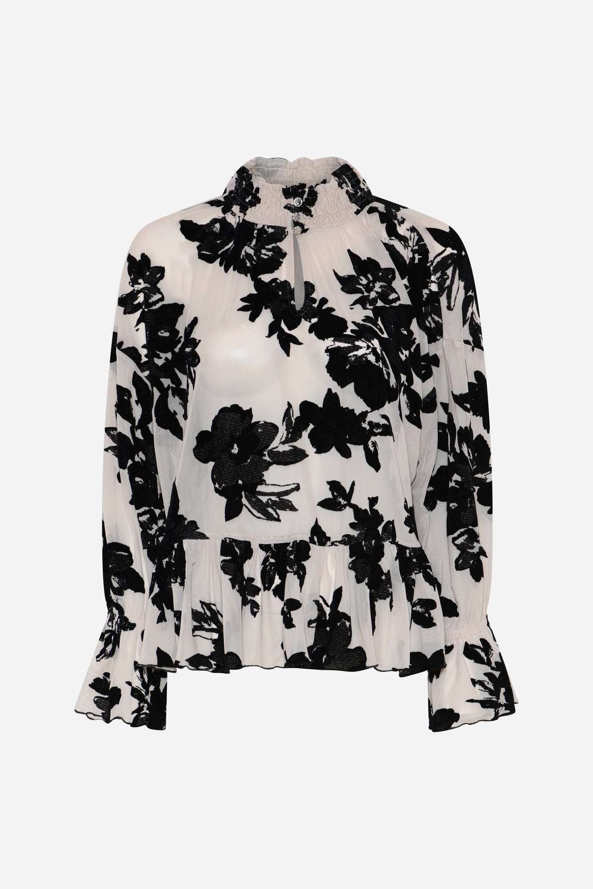 PhloxBBVitala bluse er en romantisk bluse i let gennemsigtigt materiale med almindelig pasform, høj flæsekrave og sort blomsterprint. Feminin med et elegant udtryk.