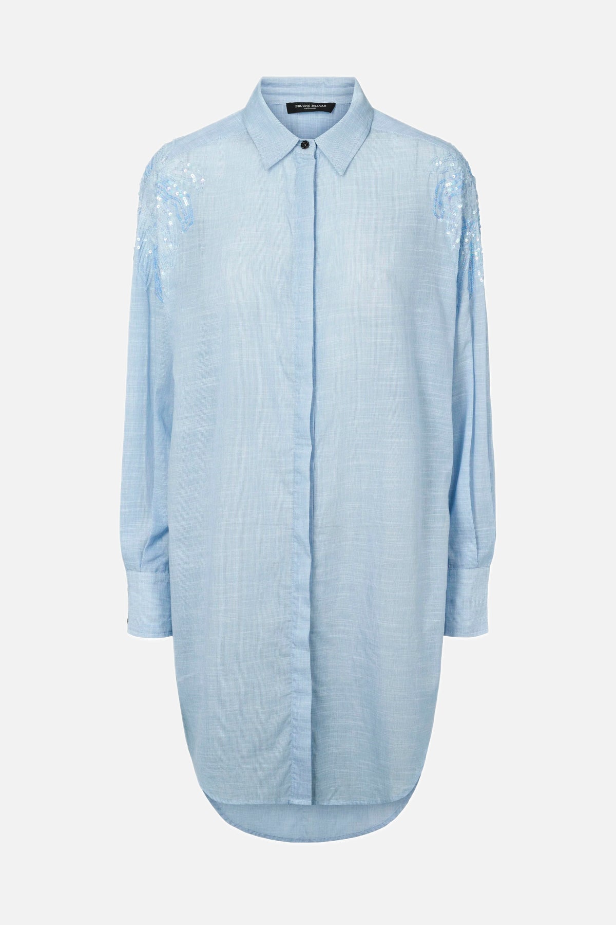 Oplev stil og komfort med vores ArgeratumBBArdes skjorte. Denne lange skjorte har en regulær pasform, der sikrer en behagelig pasform og et tidløst udtryk. Med sin skjulte knapstolpe, fine dekorative pailletter på skuldrene tilføjer denne skjorte et strejf af elegance og femininitet til din garderobe.