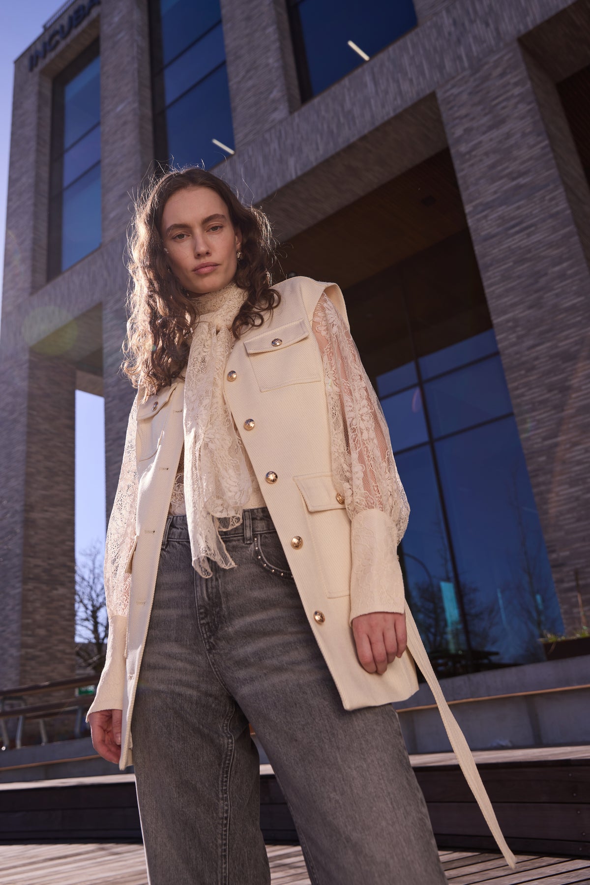 CalcareaBBThelmas vest er en stilfuld og alsidig vest med en flatterende taljering og aftageligt bindebælte, der fremhæver figuren. Med sine dekorative lommer og gyldne knapper kombinerer den militær-inspirerede detaljer med et feminint snit.