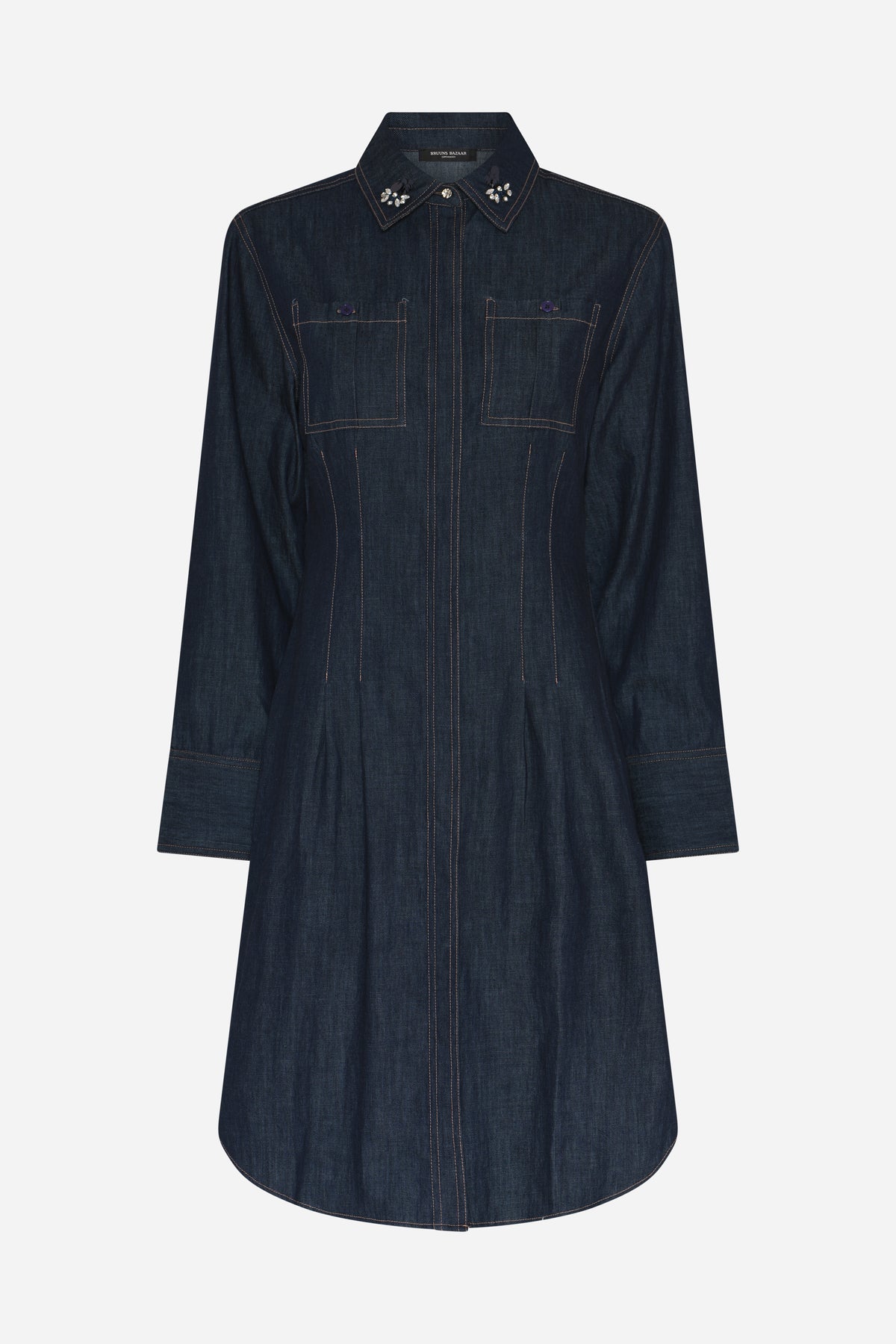 ChambraBBZiki kjole er en denimkjole med almindelig pasform, lange ærmer og ikonisk Bruuns Bazaar dekoration på kraven. En tidløs style med moderne kant.