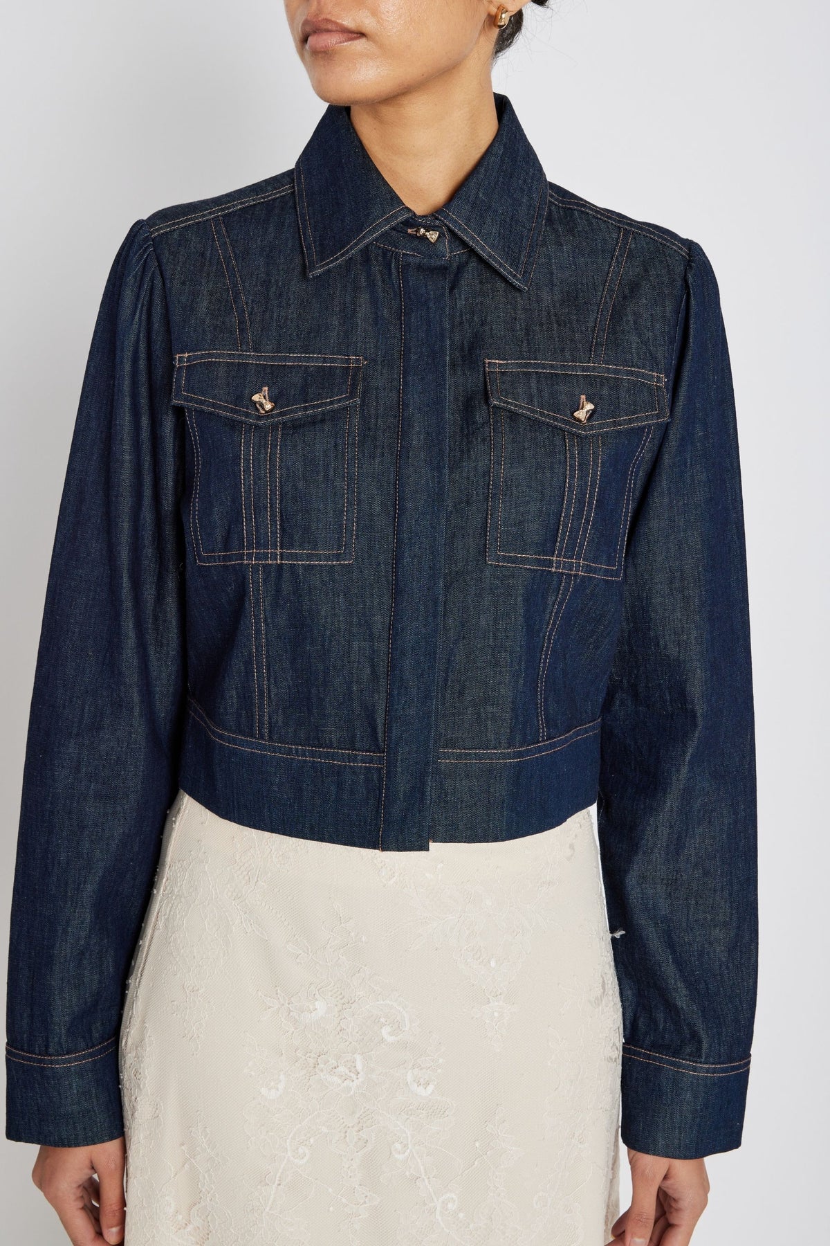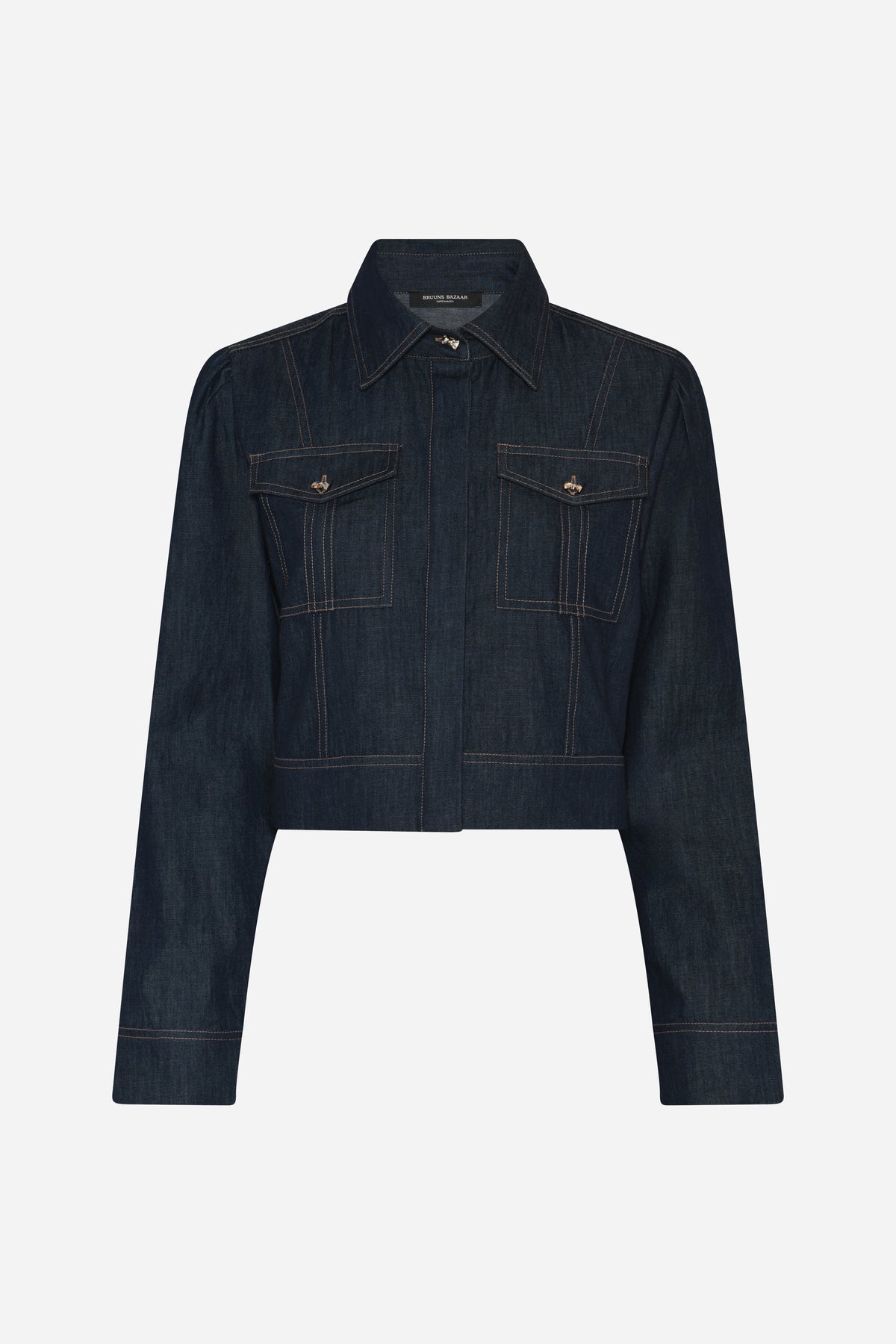 ChambraBBGlorita skjorte er en kort denimskjorte med almindelig pasform og markante stikninger, der giver et moderne og struktureret udtryk.