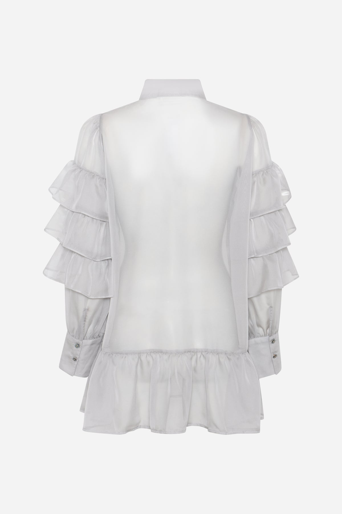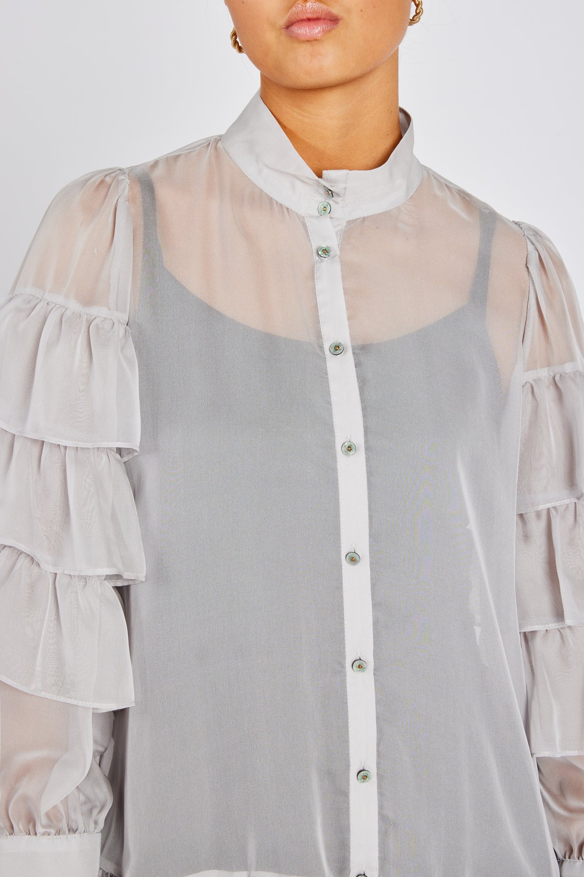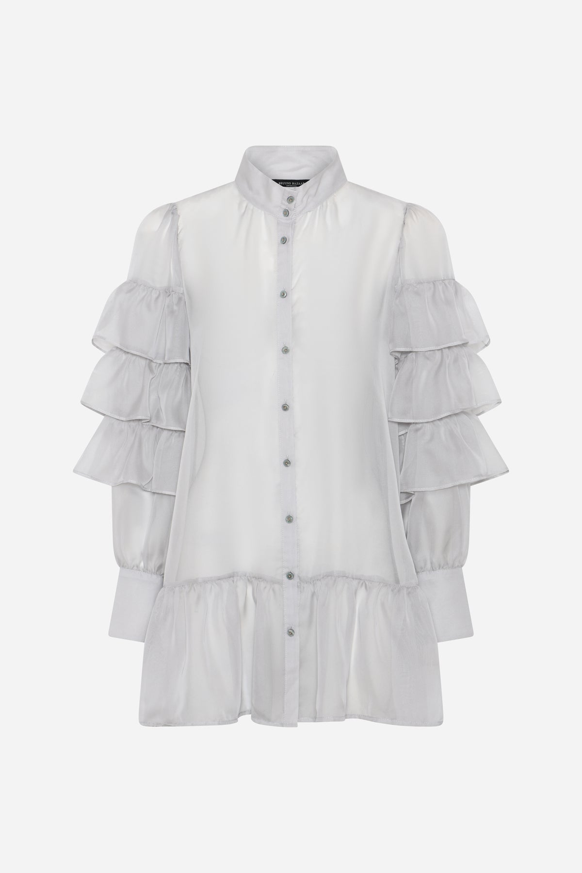CoakumBBViri lang skjorte er en let gennemsigtig skjorte i lys grå med stående krave, knaplukning og voluminøse flæsedetaljer på ærmer og kant. Et feminint statement med moderne kant.