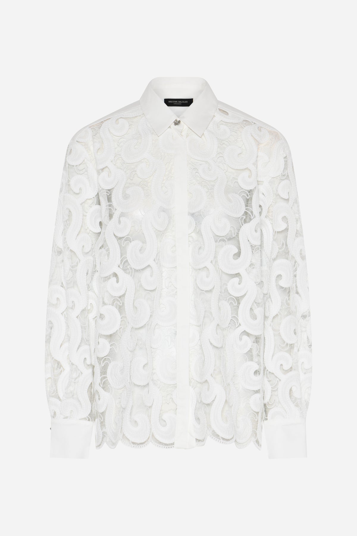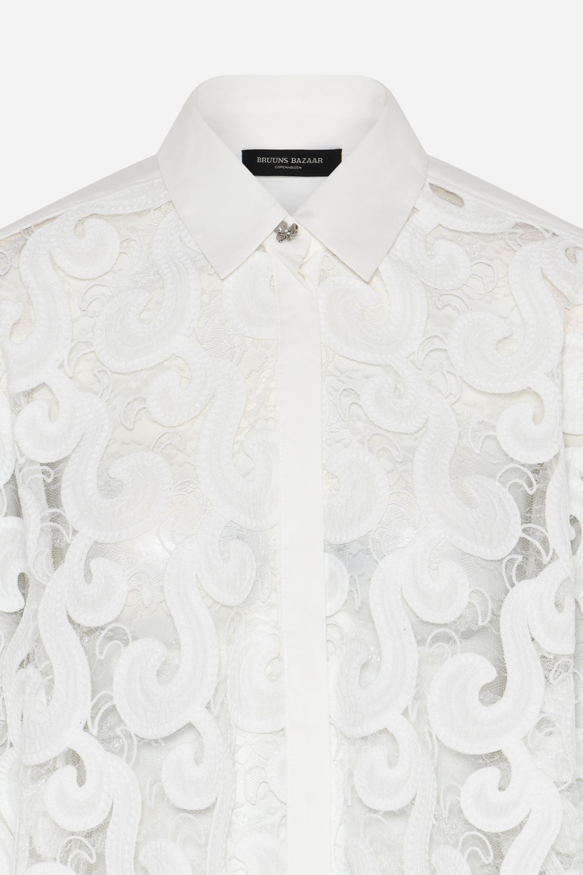 ItayaBBViveca skjorte er en feminin skjorte med almindelig pasform og et let transparent udtryk. Designet har lange ærmer, klassisk krave og gennemknapning, kombineret med et dekorativt blondemønster, der giver et elegant og eksklusivt look.