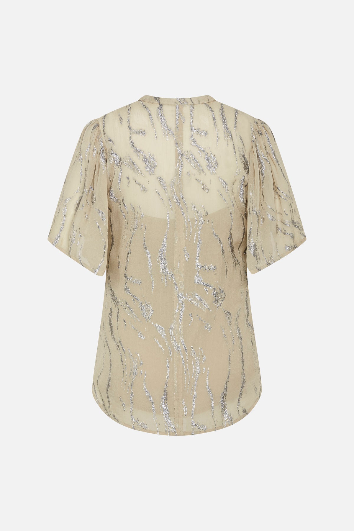 Blusen er designet med løse ærmer og er en smule længere bagpå.