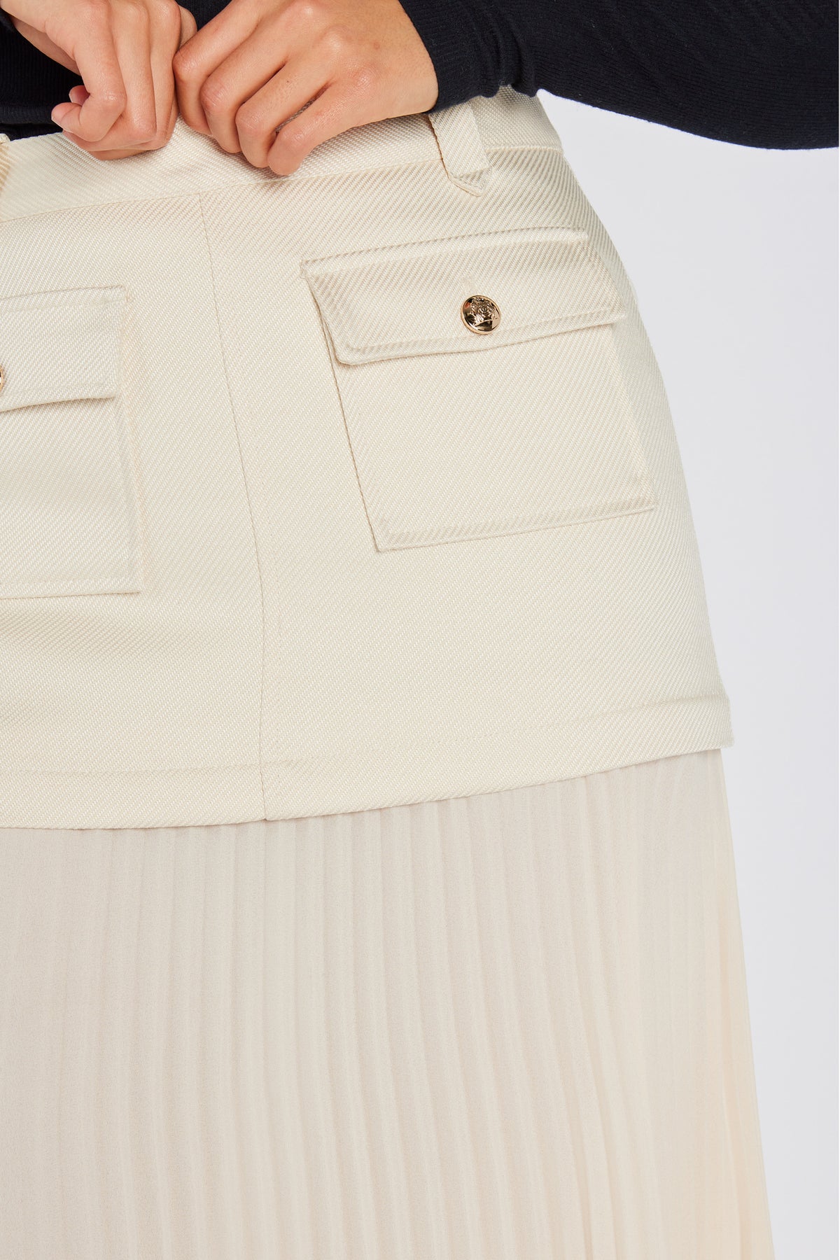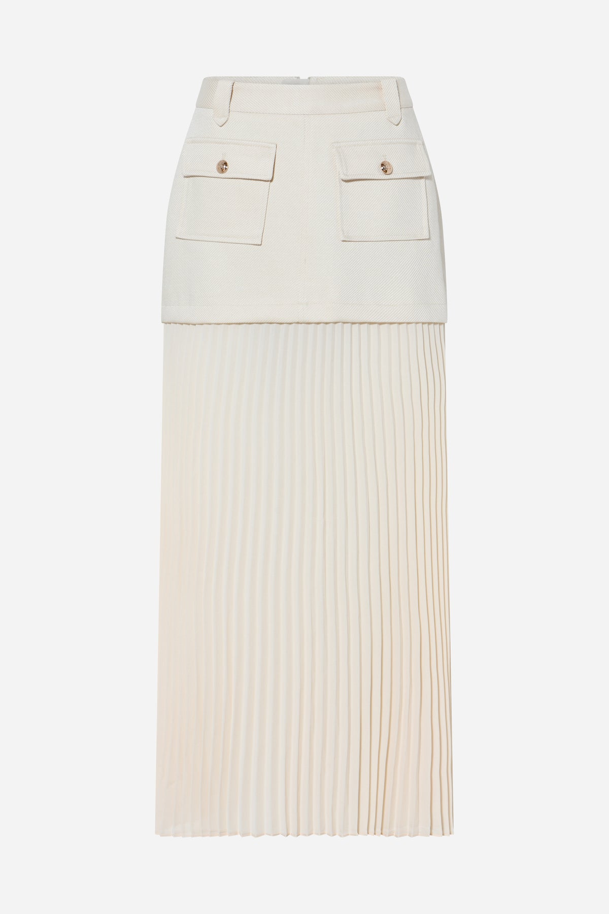CalcareaBBShennia nederdel er en elegant og moderne nederdel, der kombinerer en klassisk, struktureret top med lommer og knapdetaljer og en feminin plisseret underdel. Den højtaljede silhuet giver et sofistikeret udtryk, mens plissé-delen tilfører lethed og bevægelse. Perfekt til både kontoret og festlige lejligheder, alt efter hvordan du styler den.