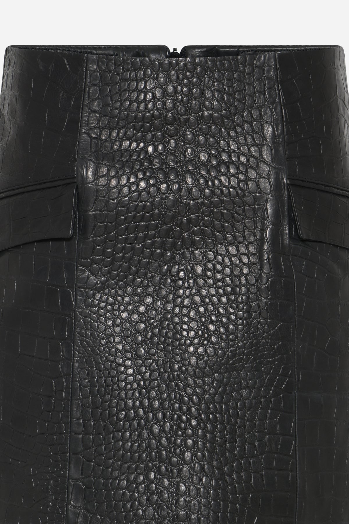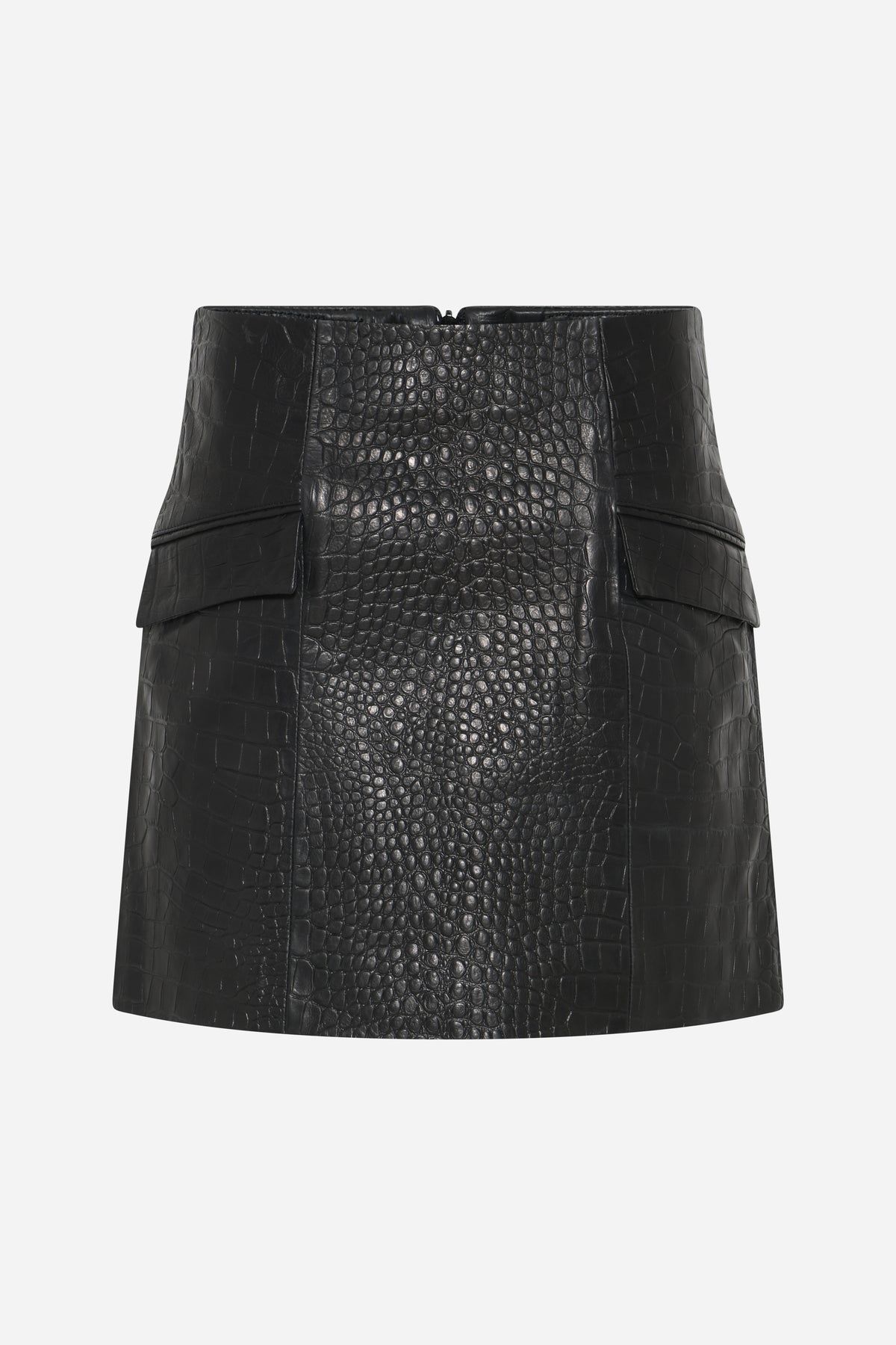 EmbossedBBSiana nederdel er en kort lædernederdel i præget materiale med slank silhuet og dekorative lommer. Et raffineret og råt statement-piece.
